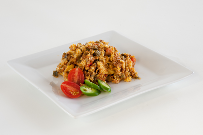 House made Mexican chorizo scrambled with farm fresh eggs, peppers, onions, and sweet potato hash brown cakes on the side.