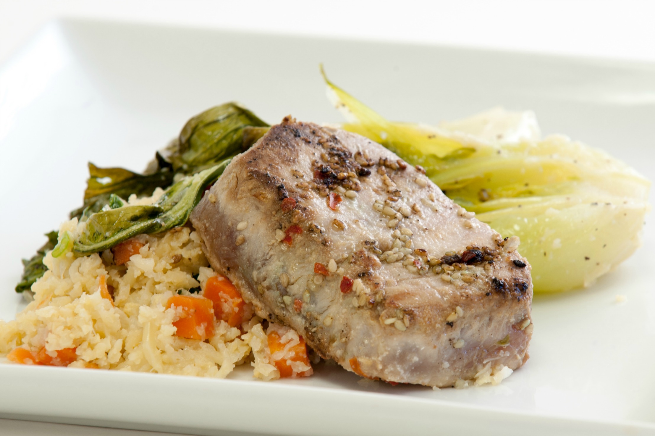 Wasabi sesame seed encrusted Tuna. Flash seared and served a wonderful Medium rare. Sweetened with our very own teriyaki cauliflower rice and baby bok choy. So much flavor, you may need to sign a waiver.